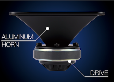 Seeour custom, machined alloy wave guide. Behind that, a massive, titanium tweeter diaphragm that’s efficient, clean and very powerful. Of course imaging and timbre matching is assured in each location using DM Mid-Series Speakers.